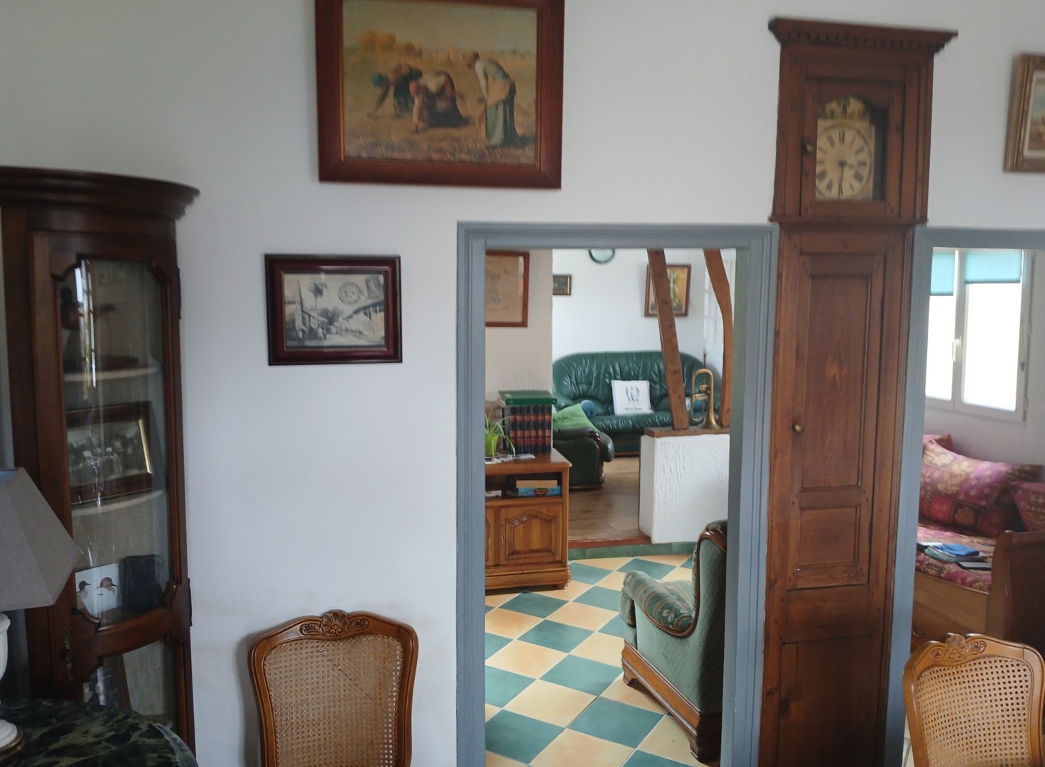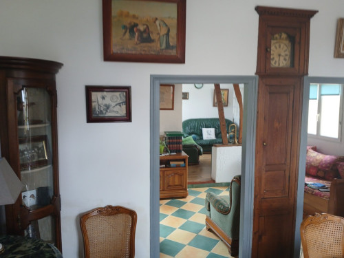 machine à laver, un séjour et un espace cocooning suivi d'un salon avec canapé et fauteuil en cuir pouvant recevoir 6 personnes